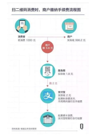 而如果使用掃碼支付,那么費率就是0.38%,如果掃碼支付1千,就需要扣除3.8元的手續(xù)費,那么這3.8元去了哪里呢?