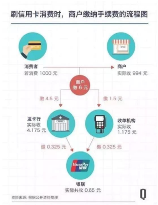 ① 按照刷卡的費率通道,咱們刷卡消費后,手續(xù)費主要是流向了銀聯(lián)、銀行、收單機構,這三個機構主要抽成比例為:發(fā)卡行0.45%,發(fā)卡行和收單機構需要向銀聯(lián)繳納0.0325%的服務費,剩下的就是收單機構賺得的。